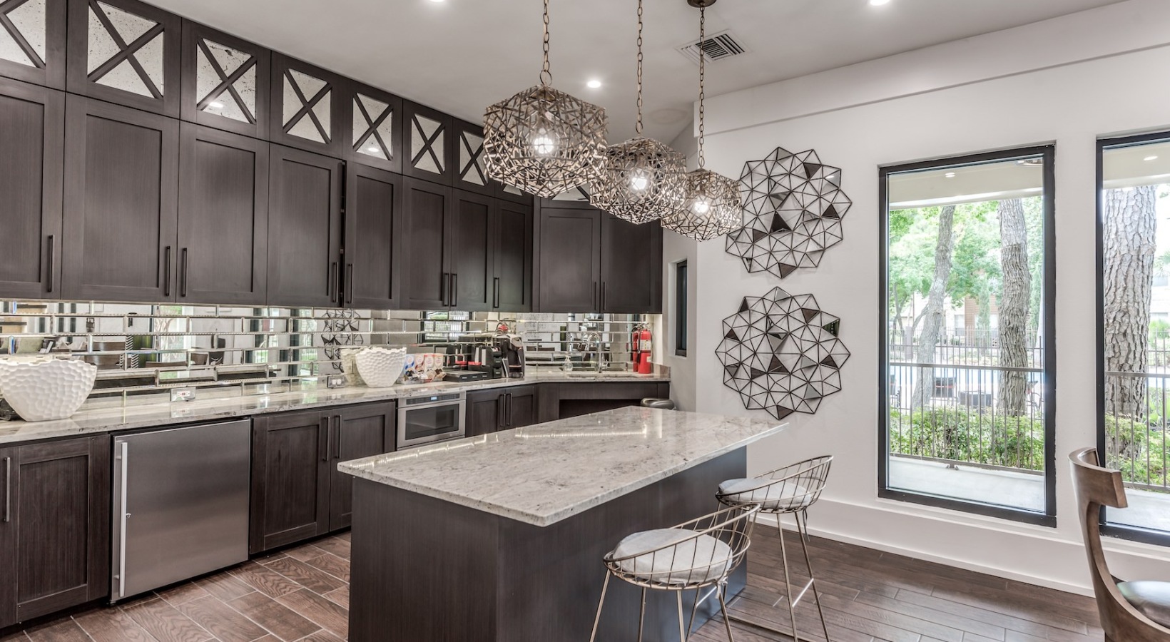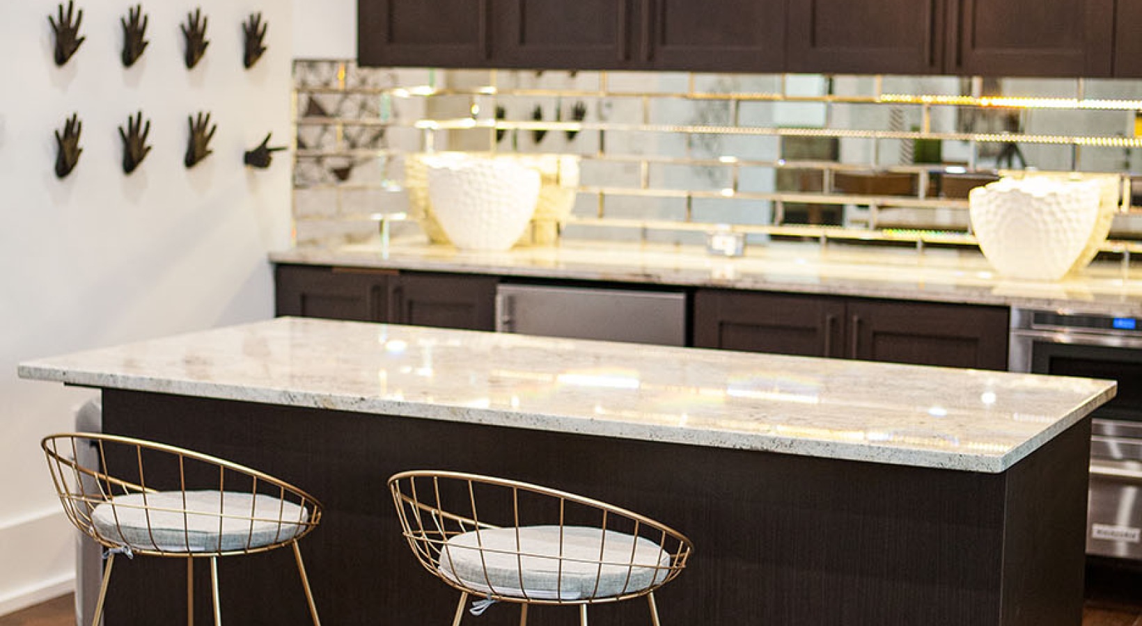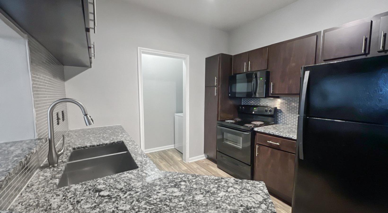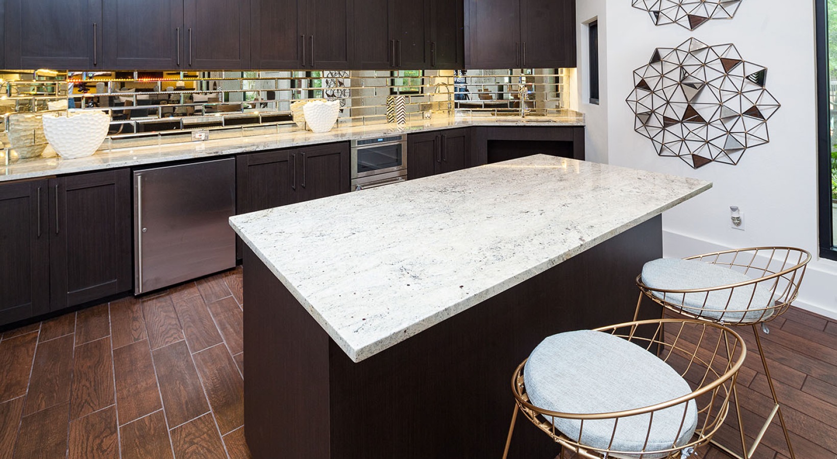 • a kitchen with marble countertops a sink a fridge and a stovetop