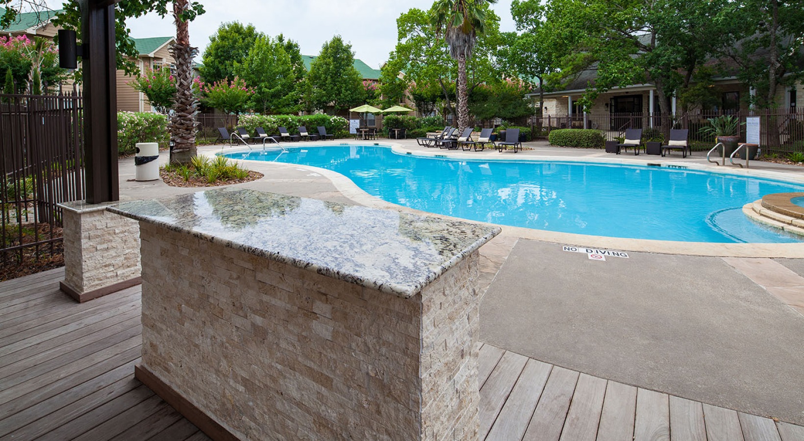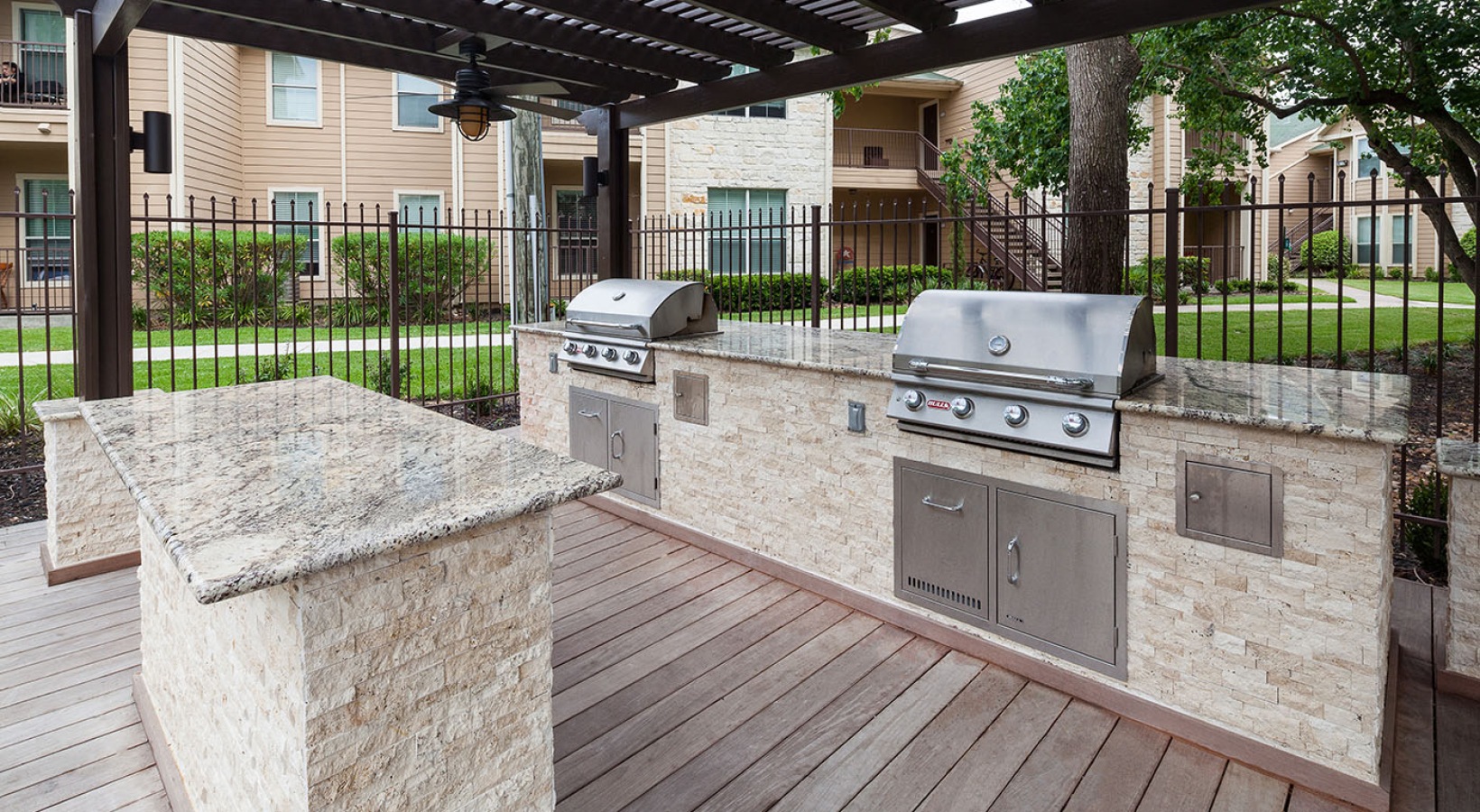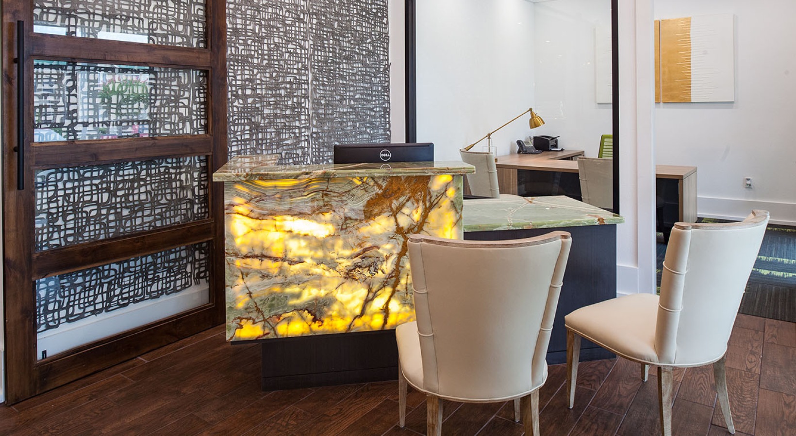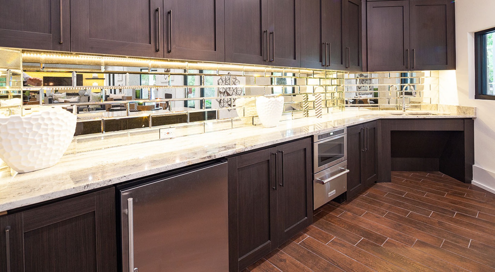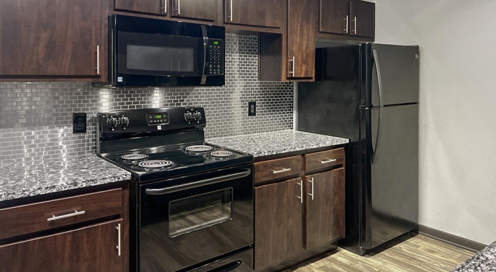 • a kitchen with marble countertops a sink a fridge and a stovetop