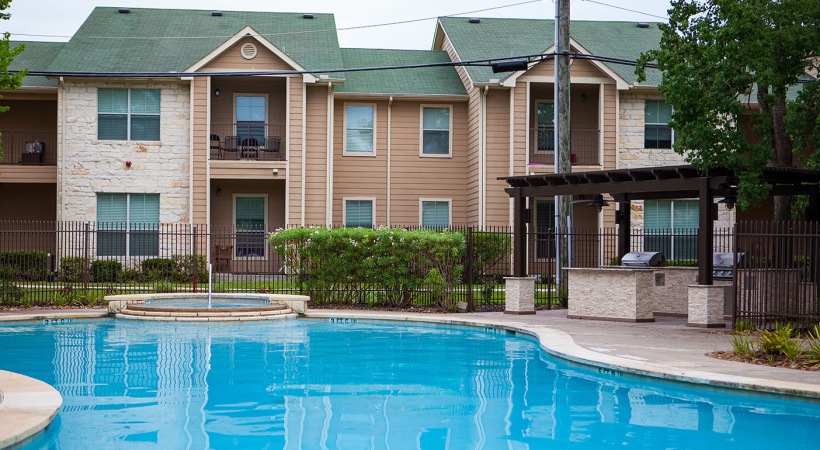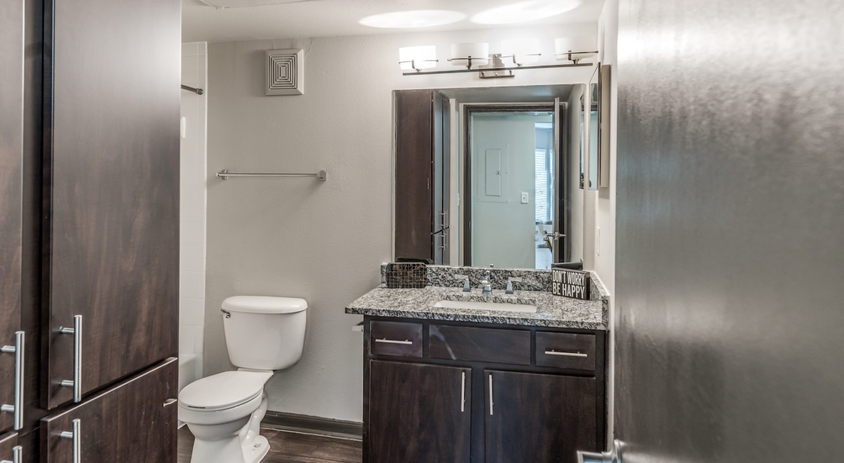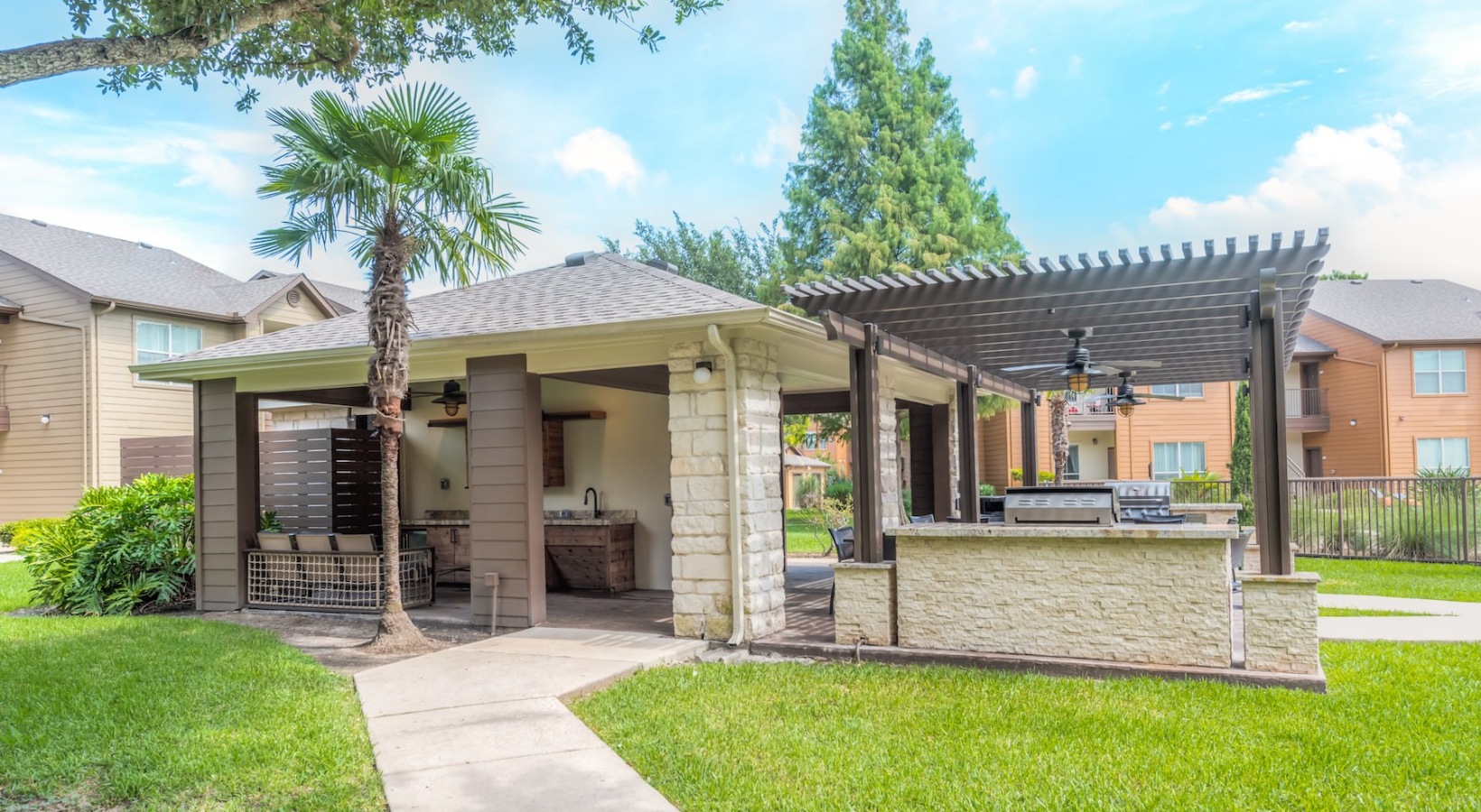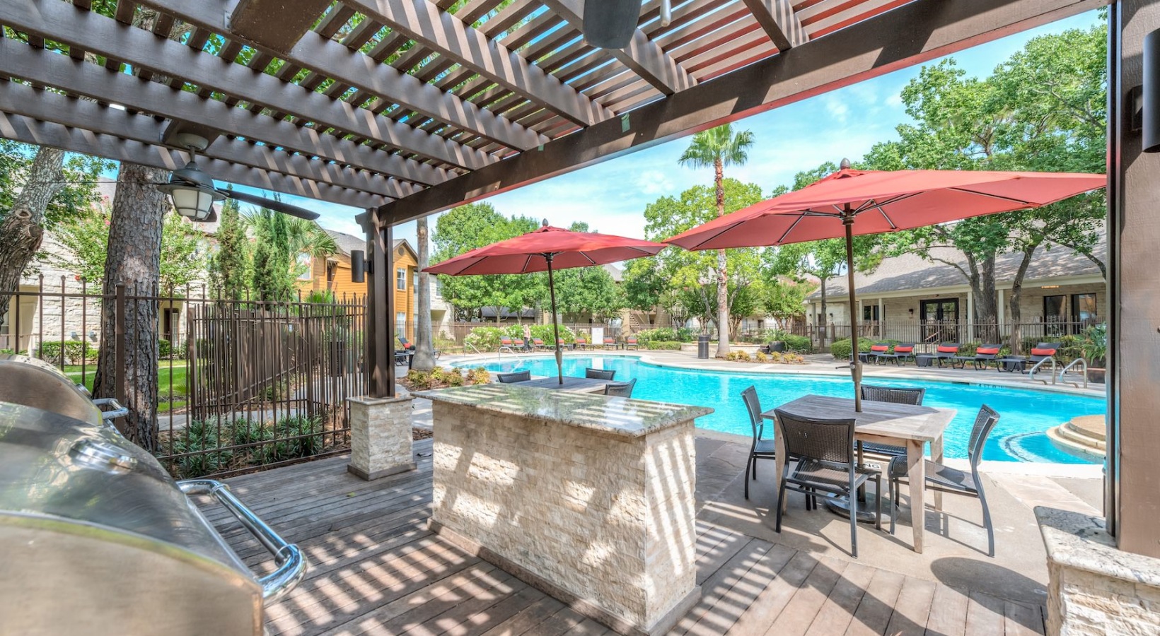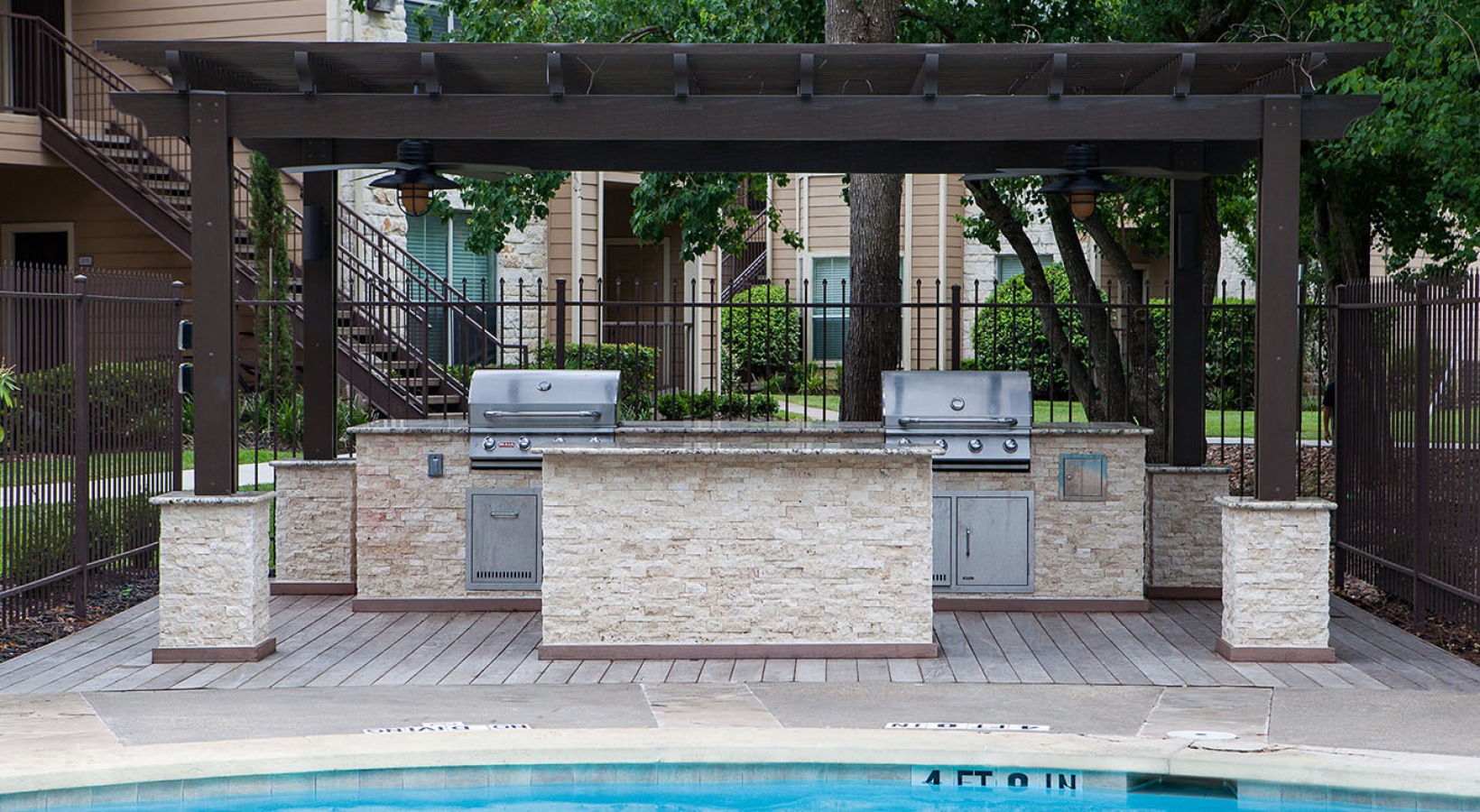 • a kitchen with marble countertops a sink a fridge and a stovetop