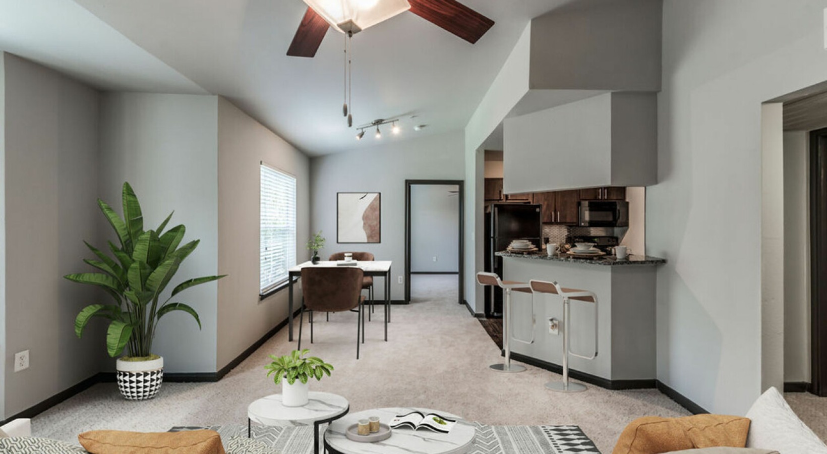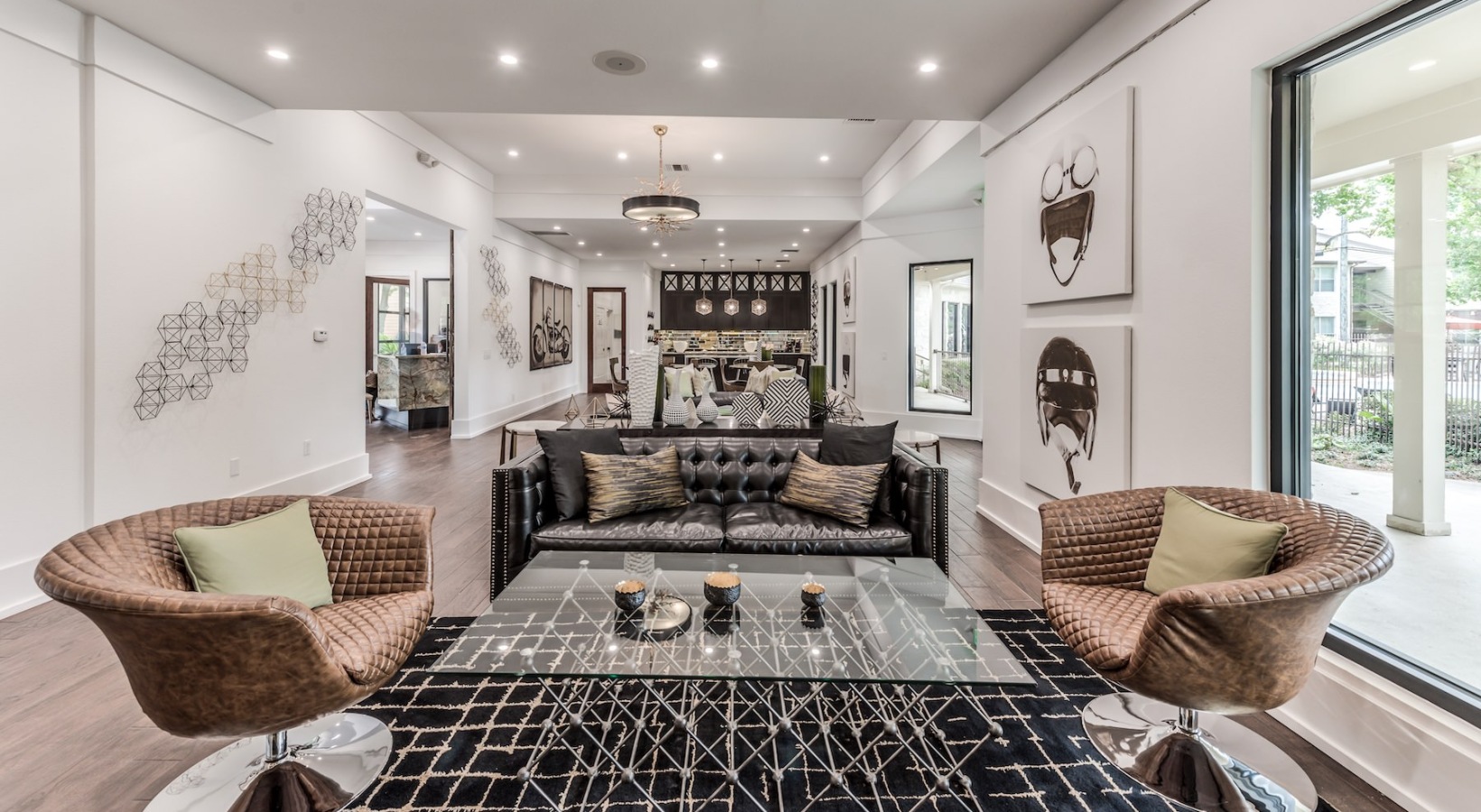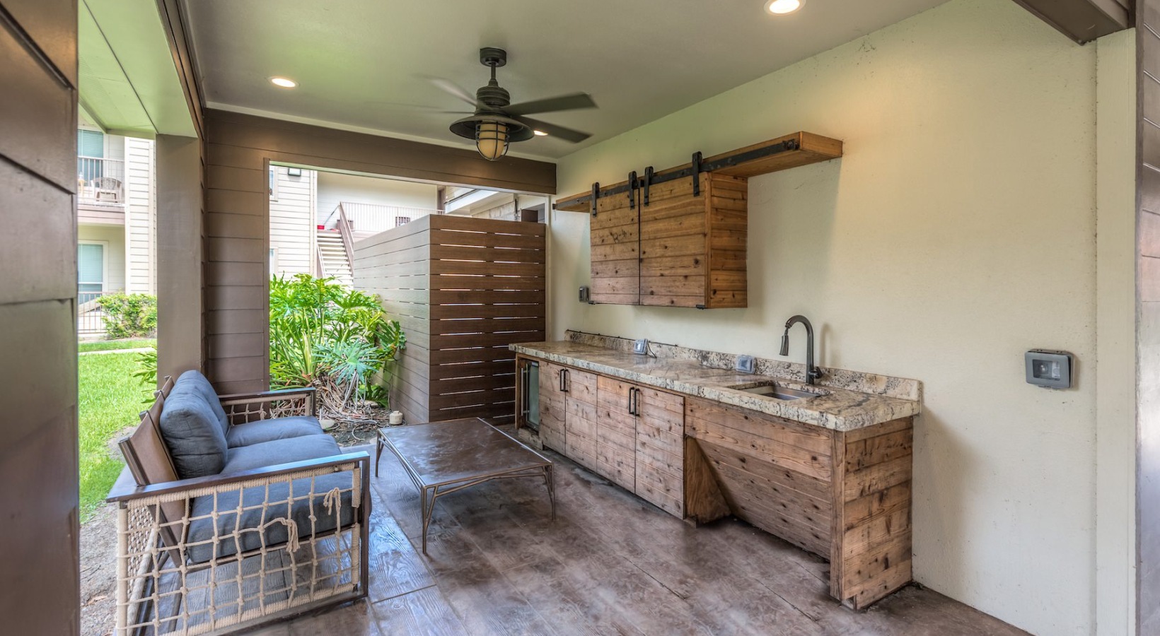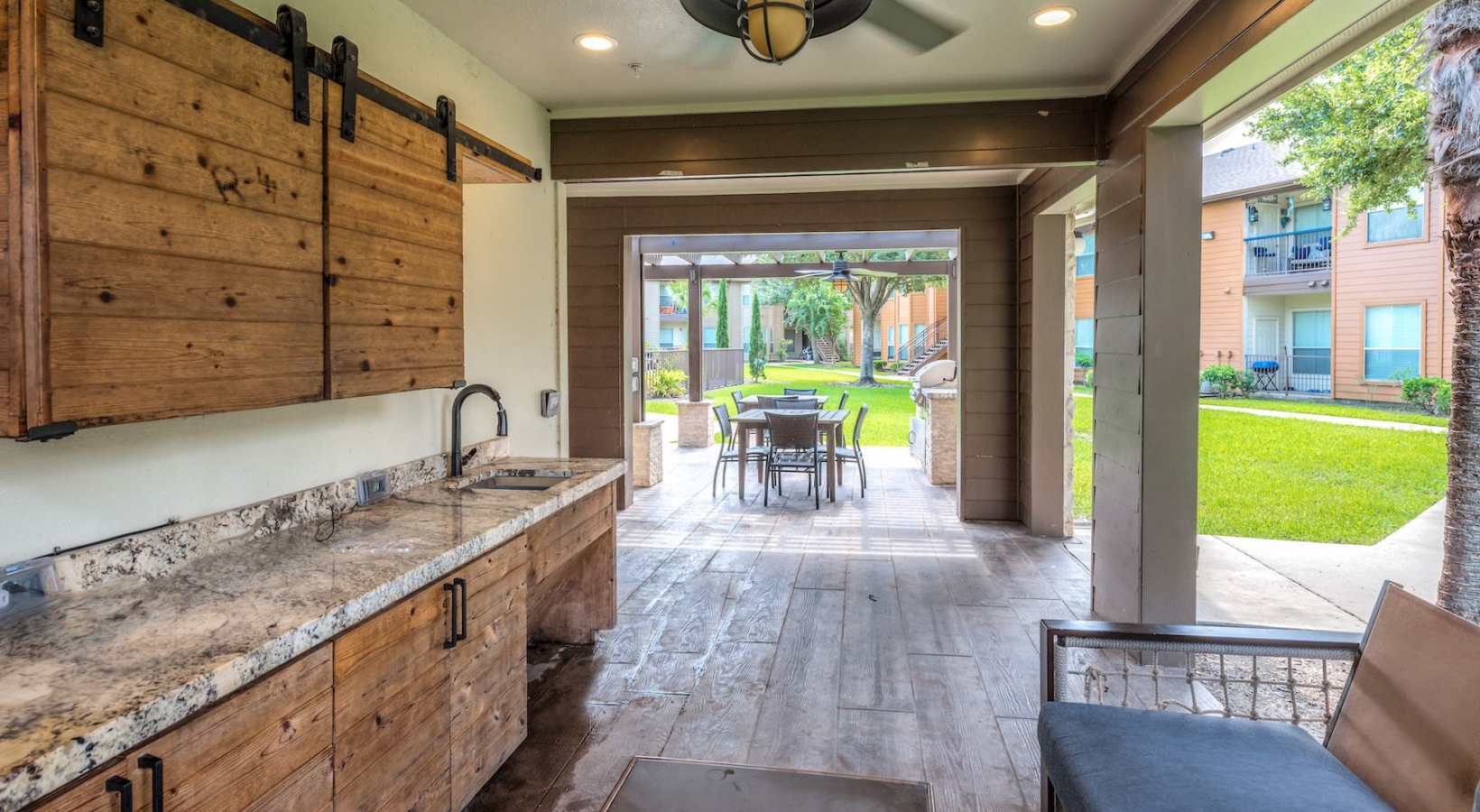 a dining room and kitchen and living room a charcuterie board spread a covered deck with seating a group of people in an office