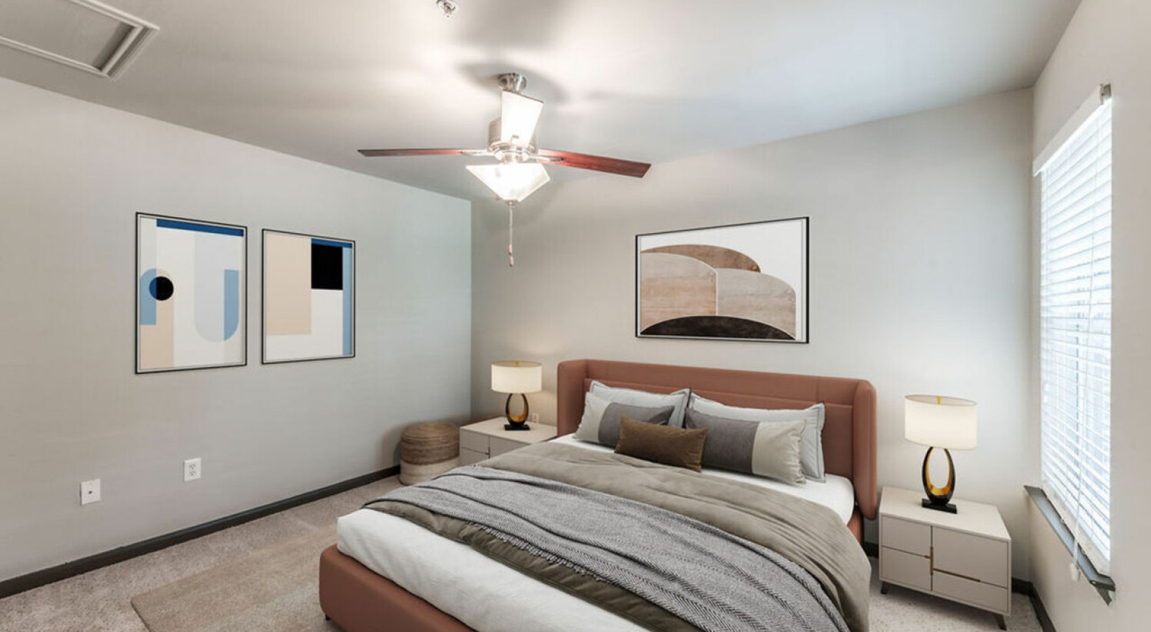 swath of sunlight shines across a well made bed and bedside table with a vase of cotton plants
